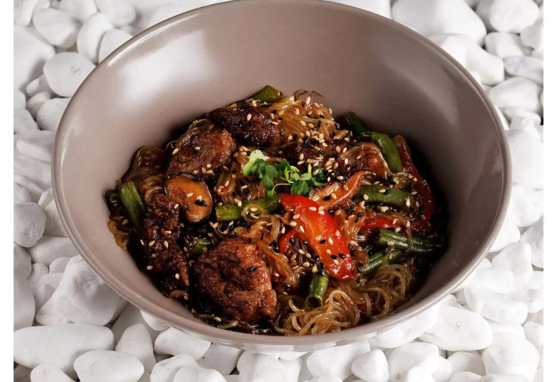 Tăițeii fini funchoza se îmbibă cu sos de soia și sos dulce-acrișor sweet chilli, păstrându-și textura și absorbând gustul bogat.