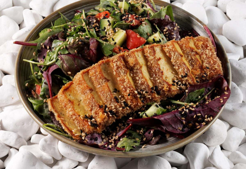Accentul principal — tofu afumat prăjit în crustă: crocant la exterior, fin și aromat la interior. Deasupra, salata este decorată cu un mix de susan pentru o notă ușor de nucă.