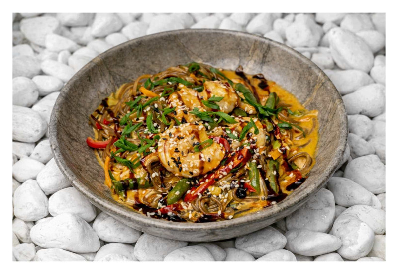 soba, crevete, morcov , zucchini, ardei gras,susan, fasole verde, ceapă verde, sos cremos