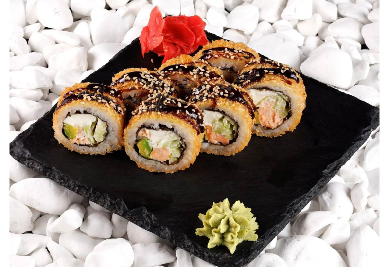În interior — brânză cremoasă Philadelphia, somon suculent și castravete . La exterior, ruloul este tăvălit în pesmet panko și prăjit în baie de ulei până la o crustă aurie.