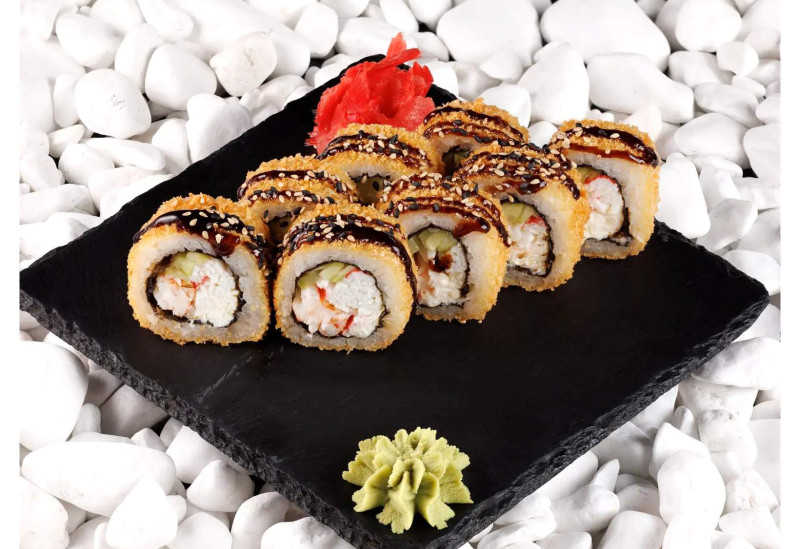 Ruloul gata preparat este tăiat în 8 bucăți ordonate, stropit cu sos unagi și presărat cu mix de susan. Fiecare bucățică combină crocantul exterior cu umplutura fină din interior.