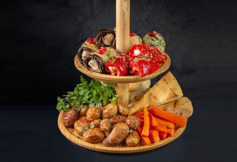 Nivelul de sus reunește aperitivele reci clasice ale Georgiei: kakliani din ardei, kakliani din vinete și pkhali — preparate vii și aromate, cu un gust intens de nuci și verdețuri.