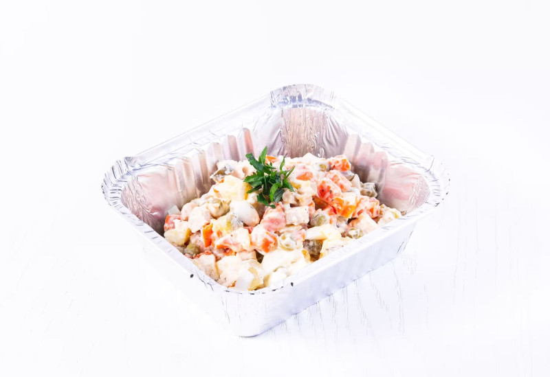 Картофель, морковь, консервированный горошек, маринованные огурцы, яйца, куриное филе, майонез, зеленый лук, зелень, соль, черный перец.