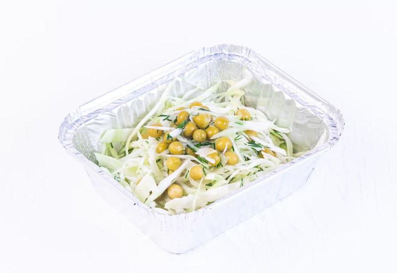 Капуста, консервированный горошек, зеленый лук, растительное масло, соль, черный перец.