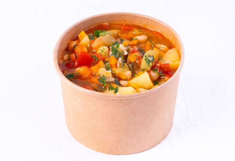 Картофель, белая фасоль, болгарский перец, помидоры, морковь, лук, стебель сельдерея, зелень, соль, черный перец.