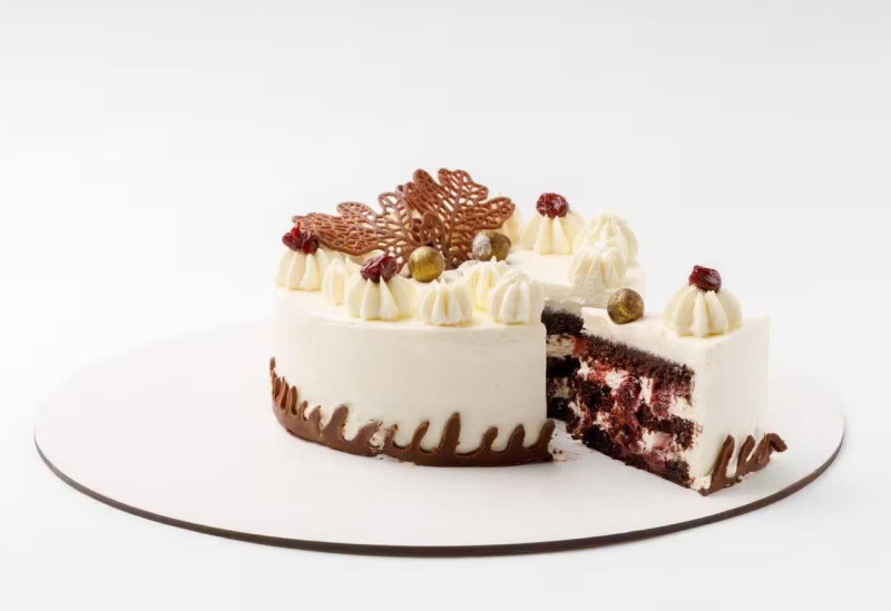 Бисквит (пшеничная мука, яйца, кефир, сливки, сахар, какао, разрыхлитель, соль), крем (сливочный сыр, сахарная пудра, сливки, сливочное масло, ванильный сахар, карамелизированная вишня).