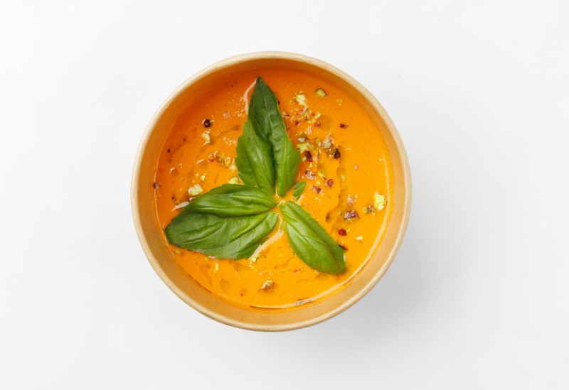 310 g / Supă-cremă catifelată, servită caldă, din roșii coapte și ardei dulce, cu ierburi aromate, acompaniată de fistic.