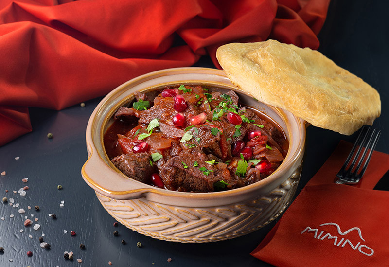 Традиционное грузинское блюдо с красивой подачей. Нежные кусочки ягненка, томленные в глиняном горшочке с запечёнными овощами и ароматными специями.
