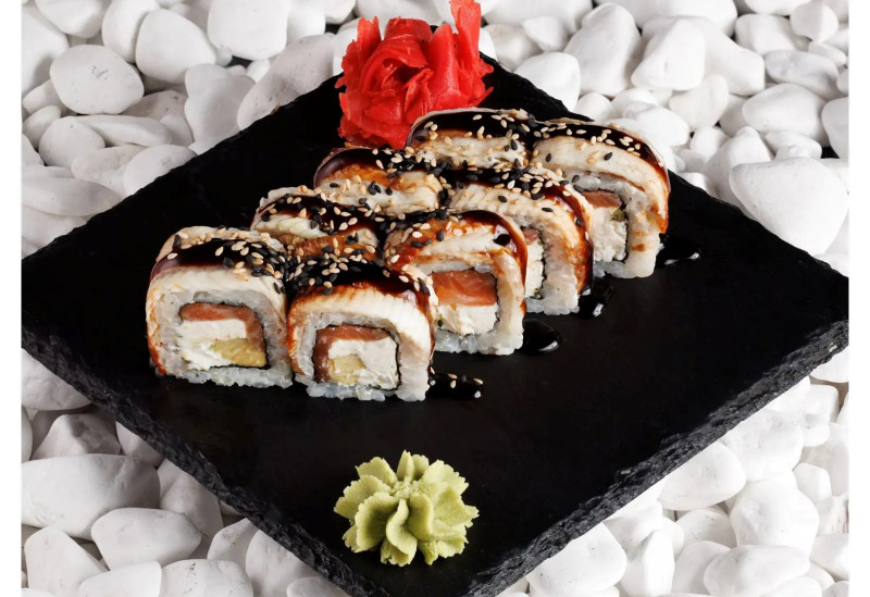 La exterior, ruloul este acoperit cu un strat de anghilă flambată cu torța pentru a-i oferi o aromă ușor afumată. Ultimul detaliu — sosul unagi și presărarea cu susan, care adaugă profunzime gustului și un aspect lucios, apetisant.