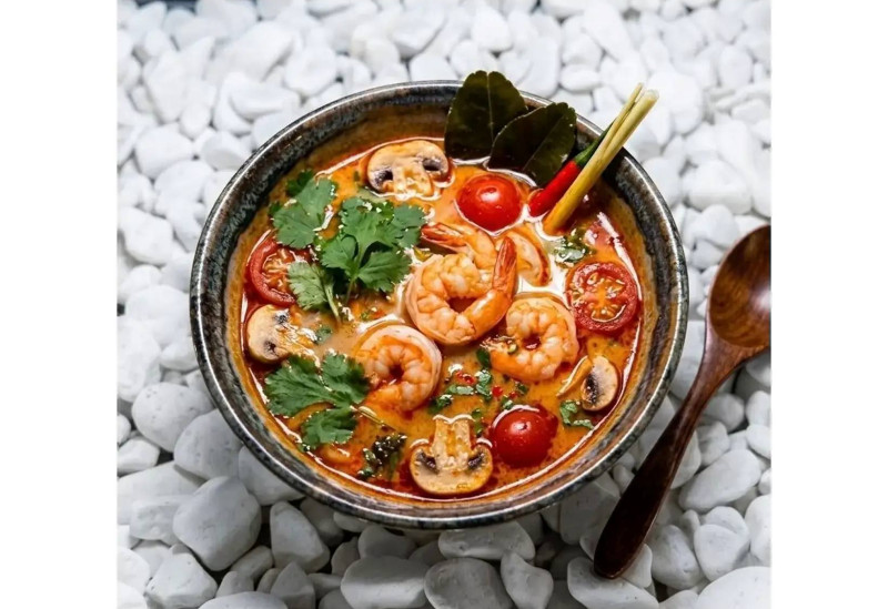 creveți,ciuperci,pasta tom yum, susan, orez, lime, micro-plante, lapte de cocos, roșii cherry
