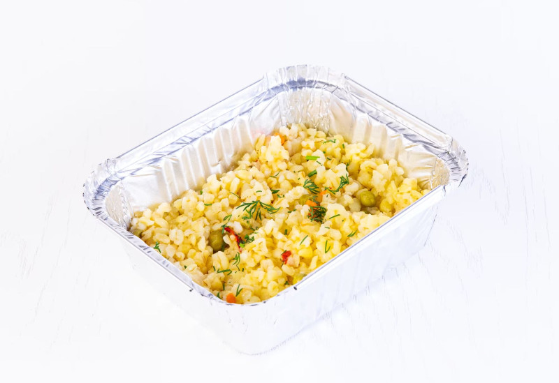 Crupe de bulgur, ardei gras, mazăre verde, morcov, unt.