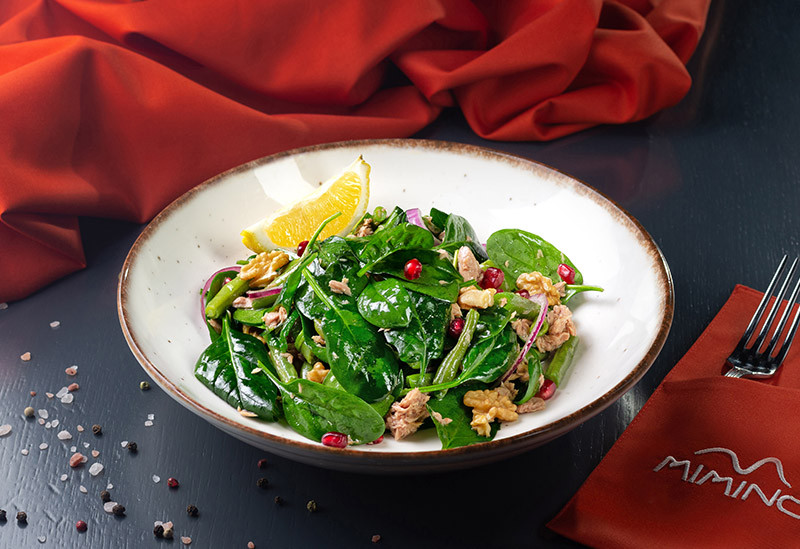 Нежный тунец и свежие листья шпината, дополненные хрустящими грецкими орехами и сочными зёрнами граната.