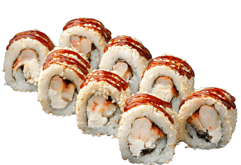 crevete Tigrate, tipar, nori, orez, castravete, cașcaval Buco, vasabi, ghimbir, sos unaghi, sos de soia, susan